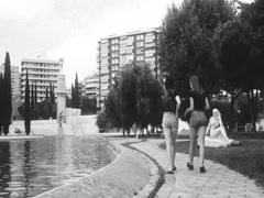 Two angel babes caressing outside pool