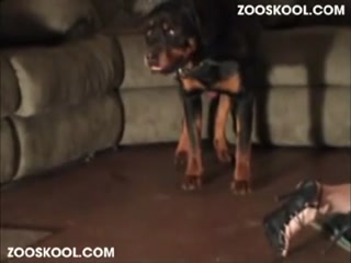 Horny girl masturbates and dog fucks hard