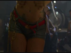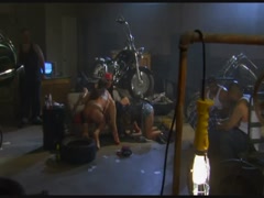 Sexy biker babes fucking group with toys at garage