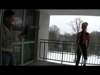 Blond smoker MILF sucks young cock on patio